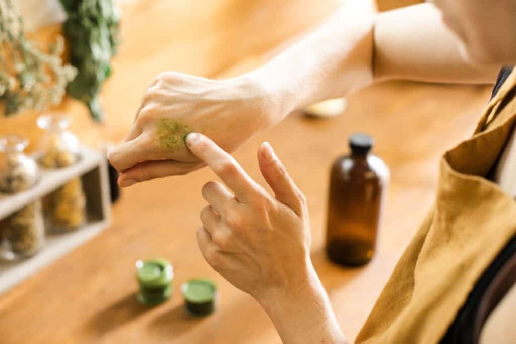 Plantain oil is dabbed onto dried scabs and itchy bug bites.