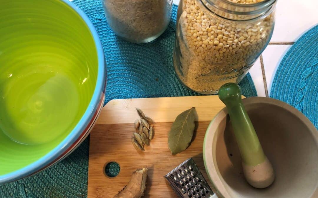 The spices in this dish all support the digestive tract and increase your nutritional uptake from the rice and mung dal. One of the main things about the spices is their carminative effect. Carminative spices help increase the flow of blood, oxygen and energy to the digestive tract, so you can digest your food better.