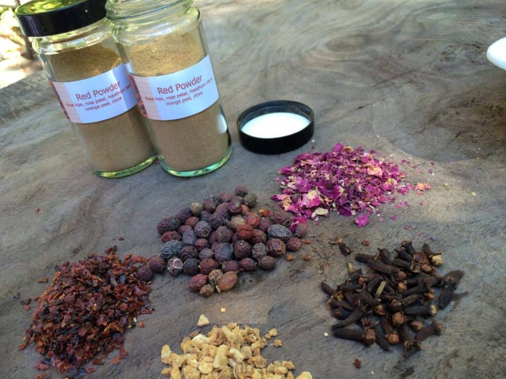 I love Red Powder on rice and apply it lavishly to eggs dishes. I put this herbal sprinkle in our summer smoothies and green drinks. It is a really delicious addition to rice dishes and is super yummy mixed with yogurt. You can even add it to oatmeal, granola or sprinkle it on winter squash or sweet potatoes.