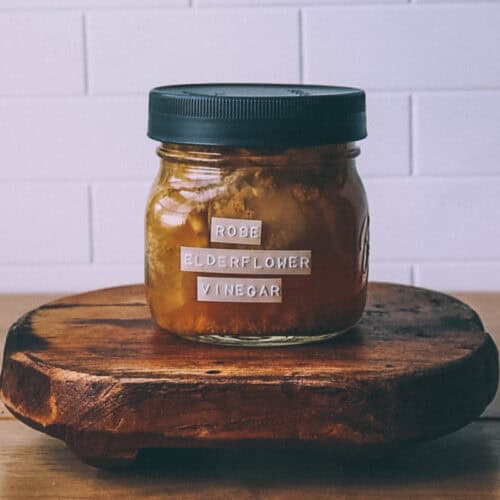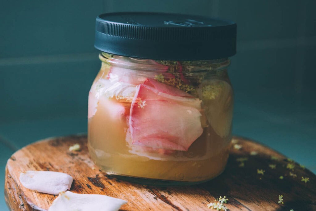 Rose and elderflower vinegar is a favorite combination for cooling and soothing the skin. Put it into a spray bottle and spray it on sunburns. The vinegar will sting the red skin for about a minute, and then it just pulls out the heat and soothes the skin. This vinegar also helps stop the itching from rashes and poison oak.