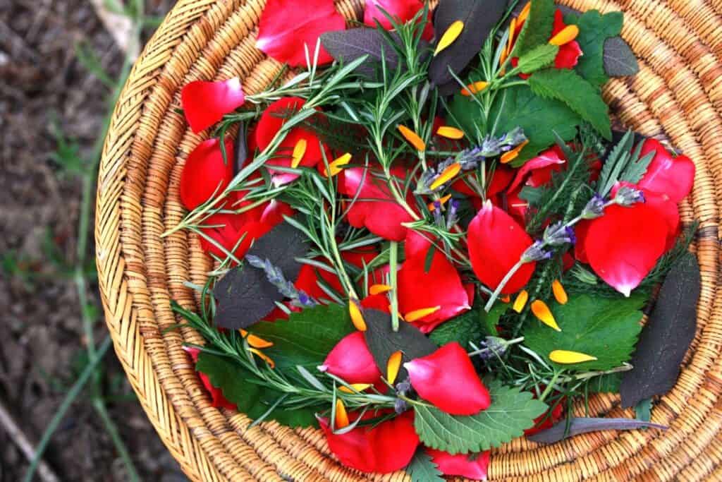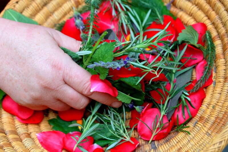 What goes into my garden bath varies from season to season. Sometimes I use one or two herbs, and other times I put in a few pieces of a dozen or more healing herbs that I have growing in my garden.