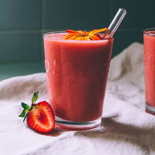 It always feels like a celebration when we get to add strawberries to our drinks. This drink is one of our favorites. I love that this strawberry smoothie offers the benefits of nutrient-rich herbs in a treat that tastes like dessert!