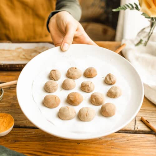 • Use a chopstick or spoon to take dough out of the bowl and roll the dough in the marshmallow root using your hands (this is helpful for preventing dough from sticking to your hands).